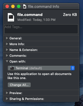 To do so, you need to tell macOS which terminal to use for the .command file type. This document presents two ways of achieving this.