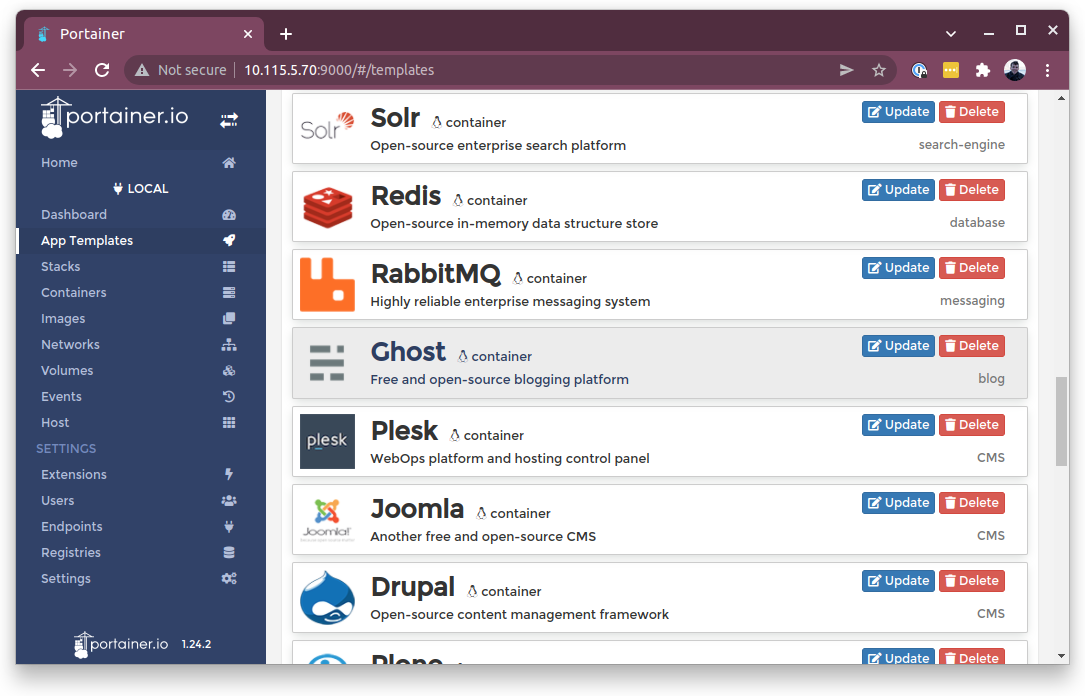 Inside Portainer, click on App Templates in the left toolbar, and scroll down to the Ghost template.